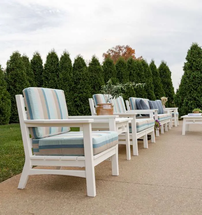 Telescope Casual is known for its quality and comfort. This luxurious designer outdoor deck furniture is incredibly low-maintenance. Powder coated aluminum furniture is rust-free, meaning little to no maintenance for you. Choose from a variety of comfortable outdoor cushions to add a splash of color to your set. Made in the USA!